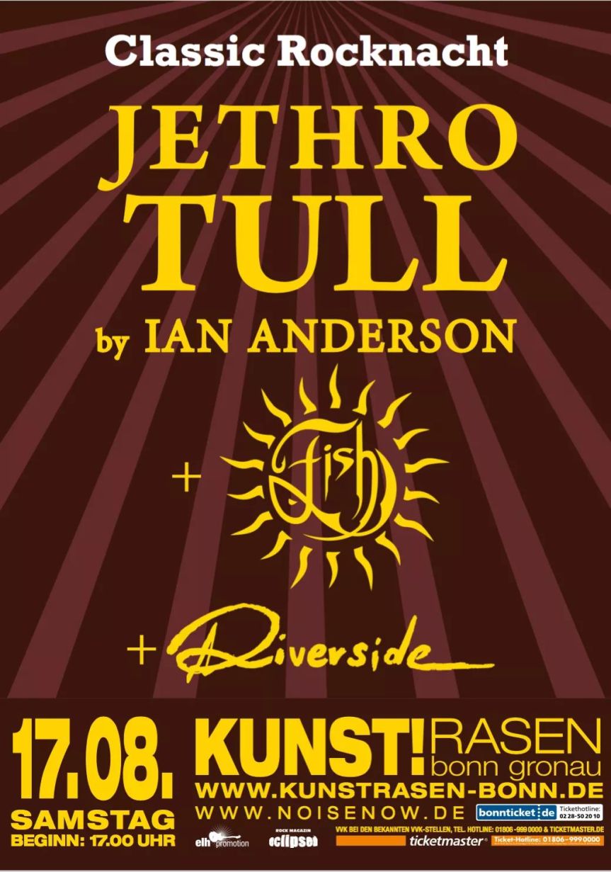 Jethro Tull, encabezado por Ian Anderson, será uno de ellos. Fish, el antiguo vocalista de Marillion y ahora solista, también ha sido confirmado. Y el tercer nombre anunciado es el de Riverside, grupo polaco de rock progresivo que está creando tendencia en el panorama musical actual.
