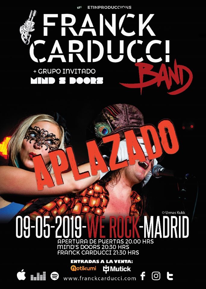 Tenemos que APLAZAR, el concierto de Franck Carducci Band + Mind’s Doors, Madrid, Sala We Rock, del cual creímos que era una de las mejores sorpresas de este año, por la falta de interés del público; En resumen, no se han vendido entradas suficientes como para realizar un espectáculo digno y que valiese la pena el desplazamiento de estos artistas internacionales.