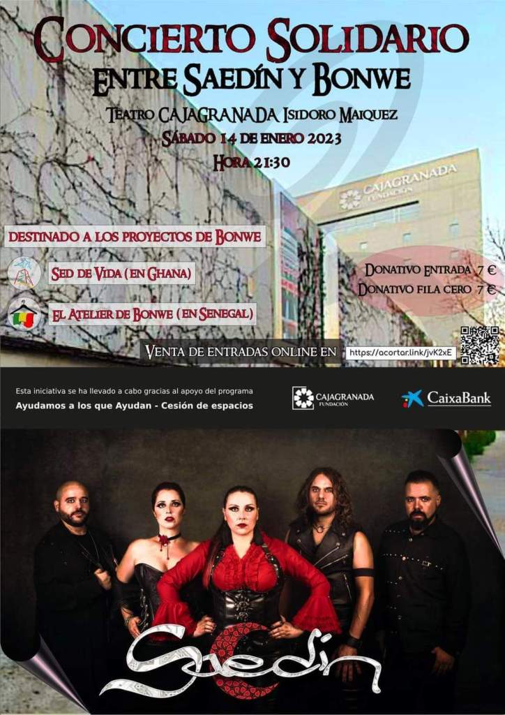 La banda granadina Saedín organiza un evento benéfico que tendrá lugar el próximo sábado 14 de enero a las 21:30h. Se trata de un concierto solidario en beneficio de la ONG BONWE, una asociación cuyo ámbito de actuación es tanto nacional con proyectos de iniciativas sociolaborales, educativas y culturales; como internacional para la cooperación al desarrollo en Ghana y Senegal en zonas rurales.