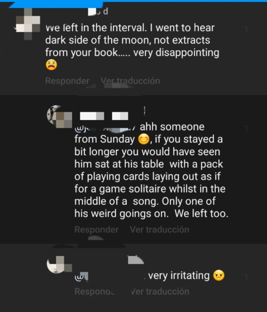 Las denuncias también llegaron a través de las redes sociales y algunas se pueden ver en Instagram. «Fui a escuchar ‘Dark Side of the Moon’, no extractos de tu libro», afirmó uno de los usuarios, añadiendo que fue «muy decepcionante». Otro usuario respondió a ese comentario:
